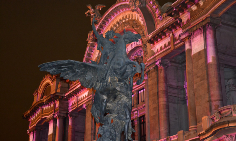 Mención especial merece la plaza localizada en la entrada principal donde pueden apreciarse las famosas esculturas de Pegaso que contrastan con la moderna belleza de la vecina Torre Latinoamericana que le da al lugar un toque cosmopolita. En 1987 la UNESCO declaro al Palacio Nacional de Bellas Artes como monumento artístico.